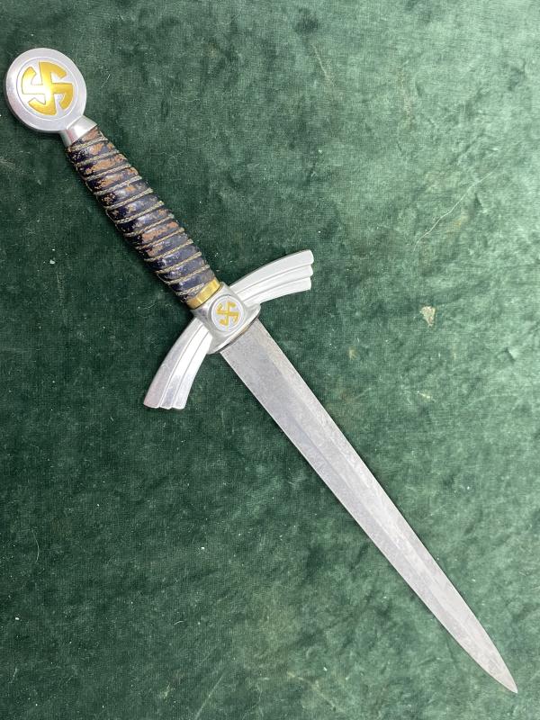 Picked up at the SoS show last month. This is a very decent 1st Luftwaffe dagger with no corresponding scabbard. Aluminium crossguard and pommel with mint gilded swastikas. Blue leather grip is a little scuffed but wire wrap etc is all present. Blade is bright and clean but has no maker.