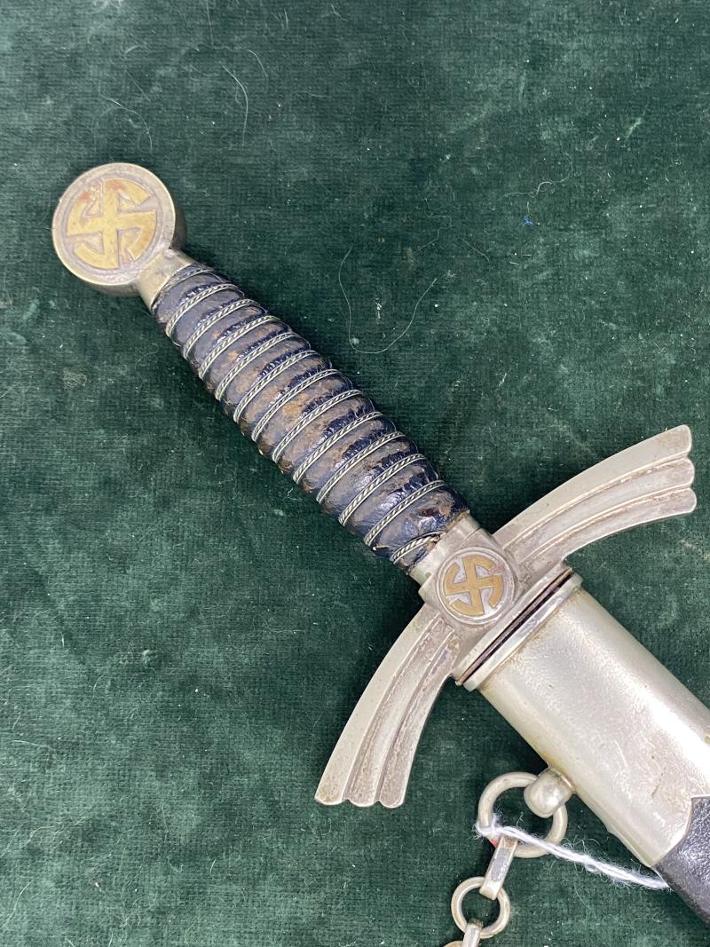 A lovely text book example of an early 1st Pattn Luftwaffe dagger carried by all officers. In the mid-1930’s. The 2nd pattn dagger was then introduced for officer ranks and this type of dagger was worn by serving NCO’s. All nickel pommel and crossguard with inlaid brass swastikas. Dark blue leather to the grip and scabbard body in excellent condition. Triple twisted grip wire. All solid nickel chain permanently attached to the upper and middle scabbard fittings. A beautiful mint nickel plated blade with the maker mark of SMF with the ‘Seated King’ trademark. On the obverse side of the blade the original Luftwaffe squadron have stamped their issue markings ‘III Ft.154.27’ This relates to the following ‘would relate to the 3rd Gruppe of Fliegergruppe 154 Faßberg, This Fliegergruppe, which was established in October 1934, was based in Faßberg before being transferred to Hannover in October 1936. In May 1939 it was renamed, becoming 'Kampfgeschwader 27 Boelcke. At this time the 3rd Gruppe of this bomber squadron was based in Delmenhorst.’