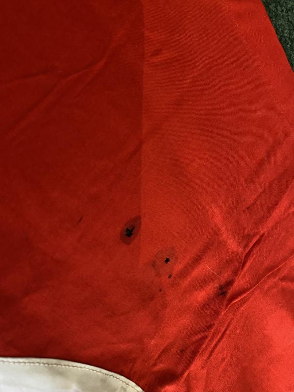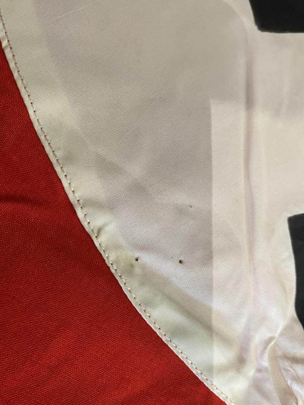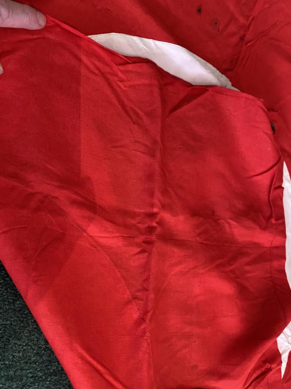 These are plenty of period pictures of these particular flags tied to the bonnets of Kubelwagens or over the turrets of the smaller tanks. Basically they are a square NSDAP party type flag, single sided, with brass or steel eyelets on each corner, so you can tie them down. They are usually in pretty bad condition!! This one is in VERY good condition with bright clear colours and brass eylessbin each corner. They are usually quite basic and just have a printed white circle in the middle with the black swastika. This one is far better! The Red backing cloth is high quality cotton annd machine seamed on all edges, and the swastika and circle are a separately applied piece of printed SILK-like material! It could be early rayon or similar, but looks and feels like silk to me. The black swastika has a couple of minor wear spots were you can see the white backing material underneath. There are two small burn’’holes in one area, which add to the authenticity Measures 30”x35”.