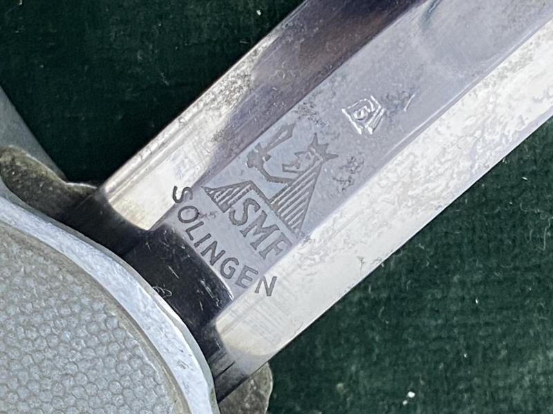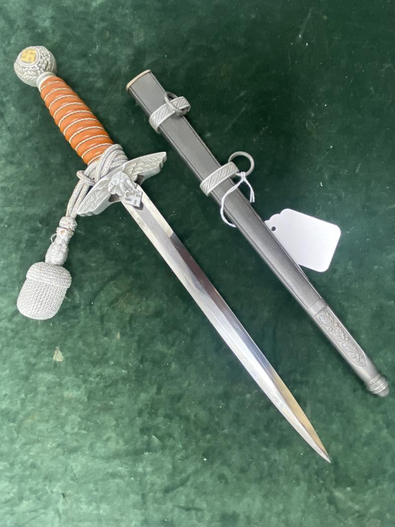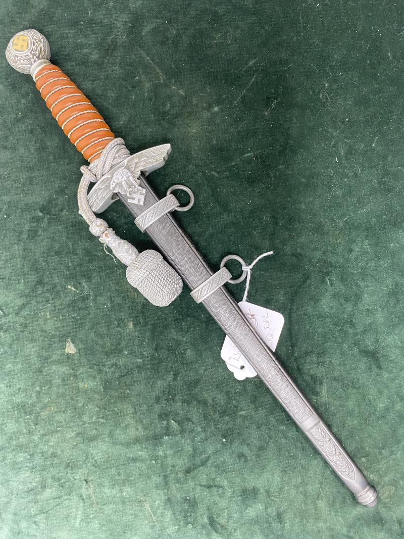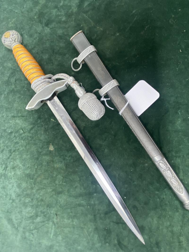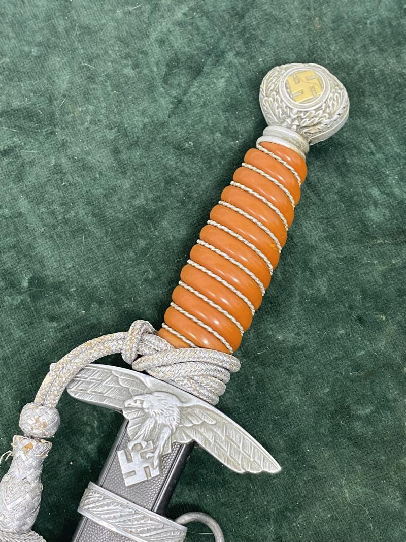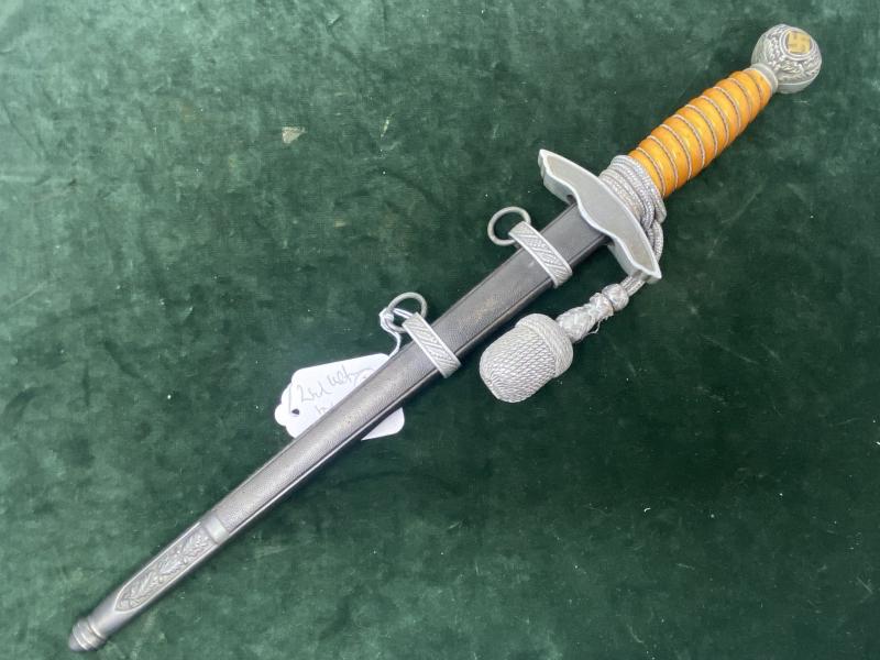 An extremely pretty example of the 2nd Pattn Luftwaffe dagger. Deep orange grip on one side, lighter on the other! Has 98% of the ORIGINAL airplane grey finish to all the exterior fittings. Original 23cm bullion knot tied in place around the grip, in mint condition. Blade is the usual nickel plated variety used by SMF and is in stone mint condition. The seated king SMF trademark, along with a stamped Waffenampt mark are on the reverse riccasso. A really superior looking dagger in amazing condition. SPECIAL OFFER…… I WILL SUPPLY A SET OF DE-LUX LUFTWAFFE HANGERS FOR £100 (usually £225) TO WHOEVER BUYS THIS DAGGER.