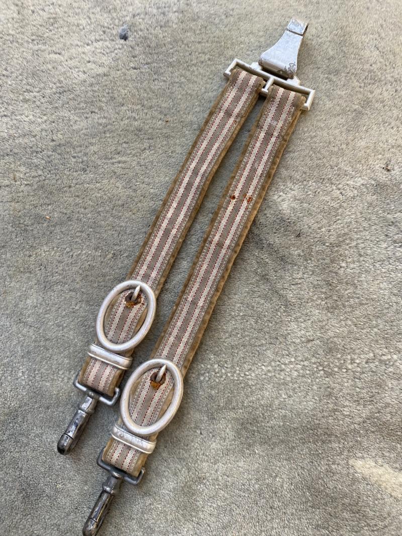 This is the type of hanger used by the very earliest of RAD hewers in 1933/34. Designed to suspend the dagger from the large scabbard side loop, they soon found that the dagger was too heavy and quickly wore through the leather lower strap. The hangers were redesigned and had a lower wide metal snap clip instead. To this end these early hangers that have survived are very rare. This is a very g... read more
